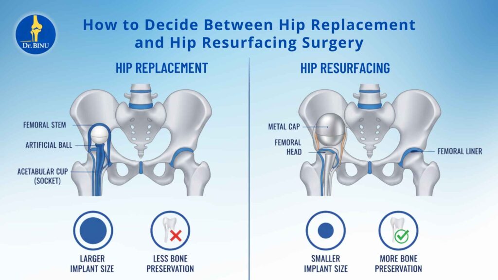 Deciding between hip replacement and hip resurfacing surgery requires a comprehensive understanding of the difference between hip replacement and resurfacing surgery, combined with expert medical advice. By evaluating individual needs through a structured hip surgery options comparison, patients can achieve optimal outcomes and long-term joint health.